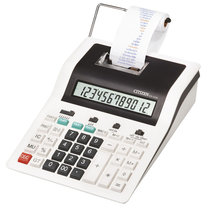 KALKULATOR STOLNI CX-123 12 mjesta; dimenzija: 255x189x61 mm; težina: 1274 g; električni; metalni držač trake; LCD ekran; dupla memorija; rola: 57mm; brzina ispisa: 2,7 reda/sekundi; potrošni materijal: valjak tintni dvobojni (crna/crvena) IR40T