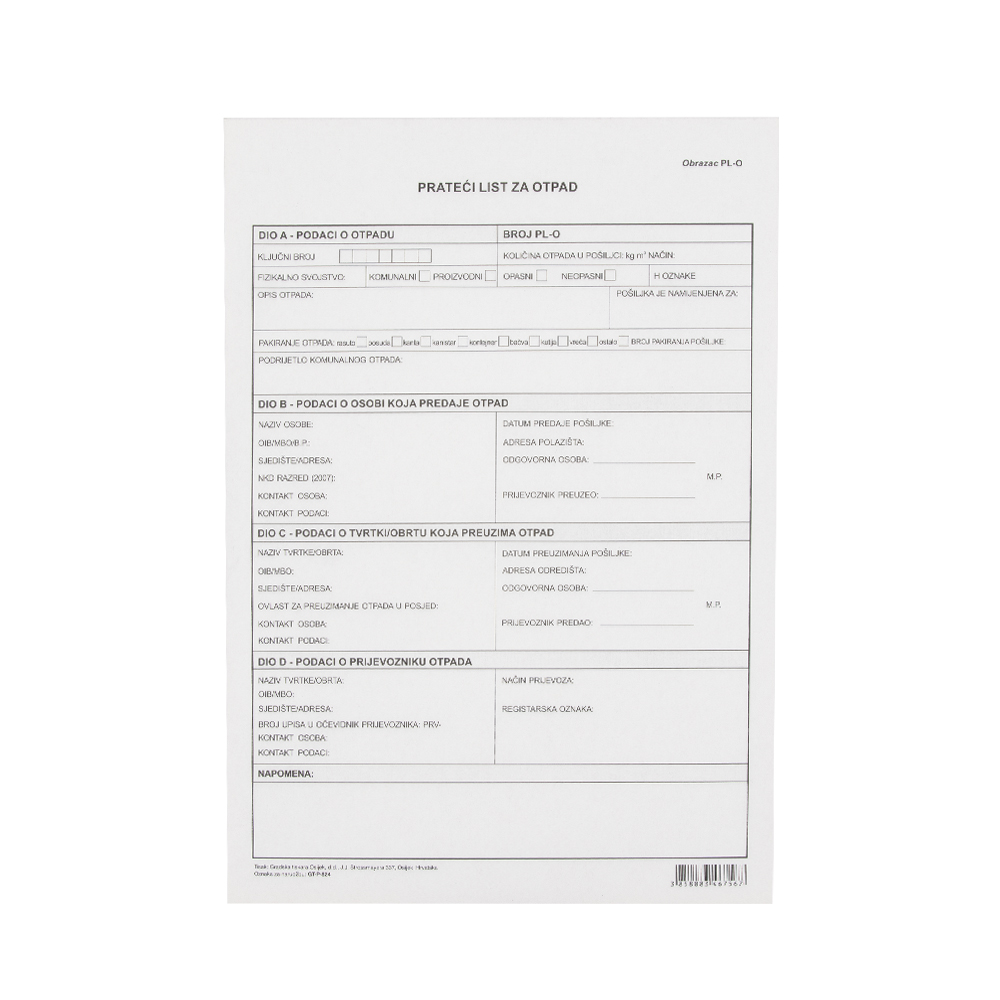 Obrazac A-824 prateći list za otpad PL-0 količina