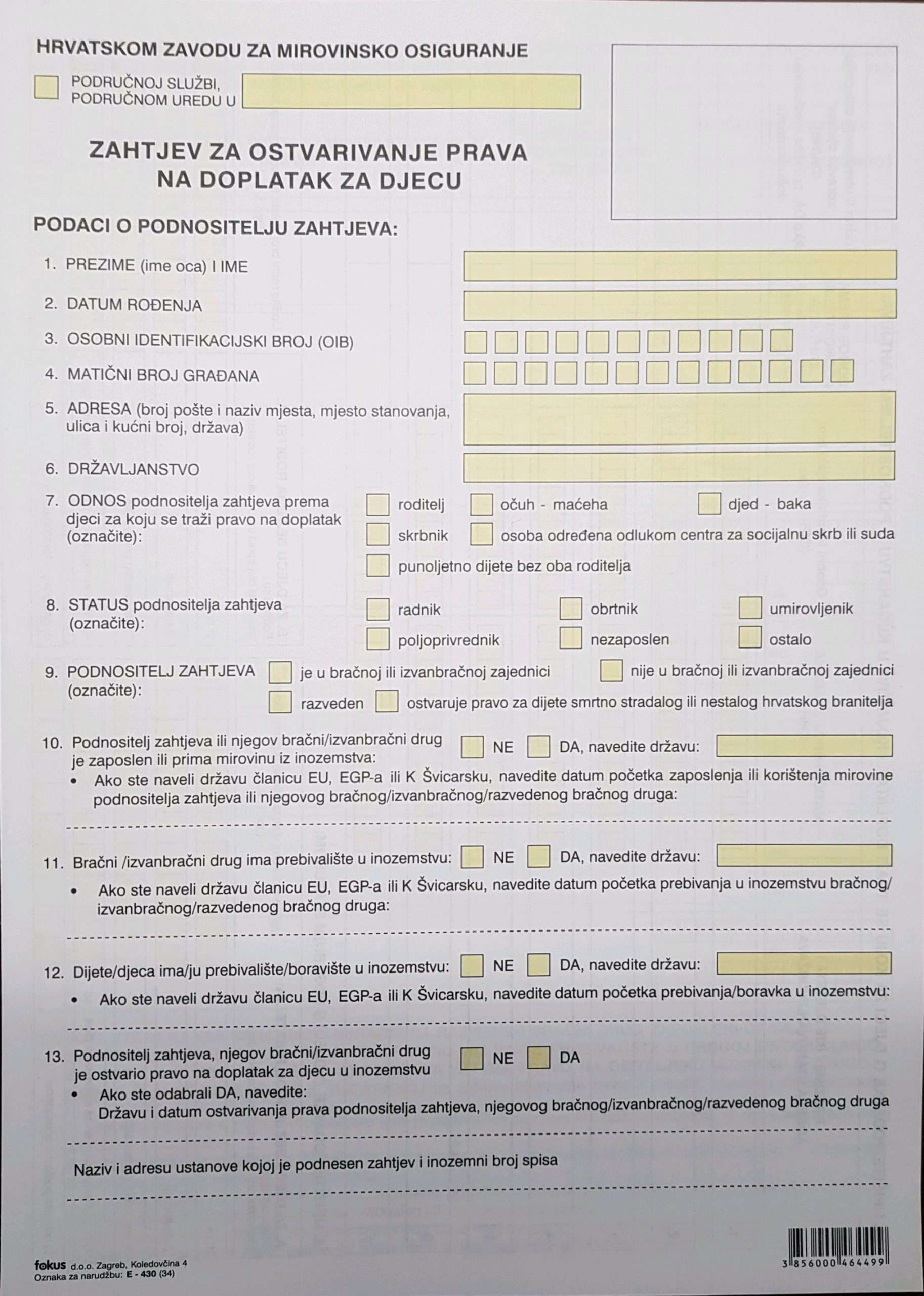 Obrazac E-430 zahtjev za dječji doplatak količina