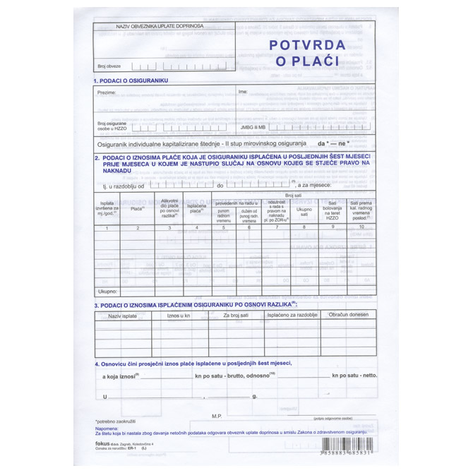 Obrazac ER-1 potvrda o plaći