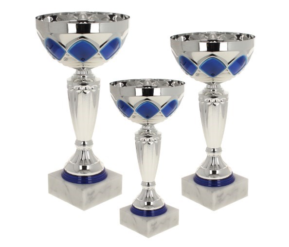 Srebrni pehar s plavim rombovima visine 24,50 cm, ima elegantan dizajn srebrnog sjaja koji privlači pažnju. Njegova osnovna struktura je visoka i vitka, pružajući elegantan izgled. Na vrhu pehara nalazi se široka kapa promjera 10 cm, koja dodaje luksuzan detalj i ističe se svojim sjajem.
